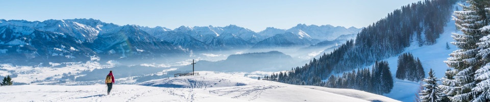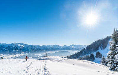 Auf präparierten Winterwanderwegen oder bei geführten Schneeschuhtouren durch den Tiefschnee erlebst du die Winterlandschaft ganz in Ruhe. Besonders malerisch ist der Winterwanderweg Kapfwaldrunde bei Oberstaufen, der durch herrliche Wälder führt und dir einen zauberhaften Blick auf die Nagelfluhkette schenkt. Hoch oben mit atemberaubendem Blick auf die Allgäuer Gipfel wanderst du mithilfe der Bergbahnen, zum Beispiel am Nebelhorn und am Fellhorn bei Oberstdorf.